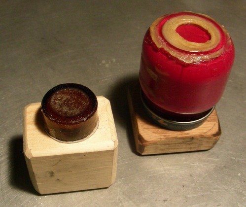 The large baby food bottle was attached to the wood by means of screws from inside the metal lid, then the bottle was put into the top. The smaller bottle was quite tall so I snapped off the opening and glued it into the hole I drill in the piece of wood.