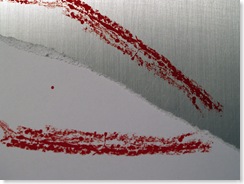 I placed a sheet of Mylar over the print in register and drew a shape to fill the area. This was transferred to a clean recycled plate using the palm press so I could regulate pressure a bit better. I didn’t press hard and only put the thicker portions of the wax unto the plate, creating a more interesting texture. Then to make sure the odorless solvent would not remove any of the image, I heated the plate with a paint stripper heat gun. This was a precaution as my tests showed this was not necessary. Next I applied a coat of silicone and left it to cure overnight. Next day to start printing, I washed out the image with water and rolled up the plate with a brayer.